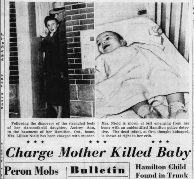 On April 16, 1953, the Globe and Mail reported the story under the headline ‘Hamilton Infant Strangled: Dick Case Officer Again Finds Baby in Trunk. Hamilton, April 15: The body of a 6-month-old baby girl was found in a small trunk in the basement of her parents’ home late this afternoon. A piece of cloth was wrapped tightly around the child’s neck and she had died of strangulation.
