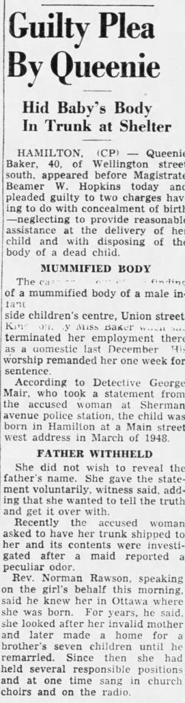 The next day, the Globe and Mail reported that Queenie had pled guilty to charges: ‘February 7, 1950 Globe and Mail: Admits 2 Charges as Baby’s Body Found in Trunk: Hamilton, Feb. 6 (Staff) – Queenie Baker, 40, of Wellington Street S. today pleaded guilty to two charges in connection with the discovery of a baby’s body in a trunk in Kingston last week. The charges were neglecting to provide reasonable assistance at the delivery of a child, and disposing of the body of a dead child.’