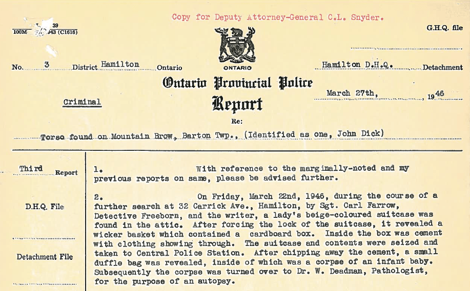 The Ontario Provincial Police released their March 27th 1946 report: Re: Torso found on Mountain Brow, Barton Twp., (Identified as one, John Dick) Third Report Hamilton D. H. Q.