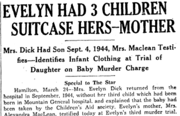 Over on page 2 Evelyn’s story continued: ‘Detective John Freeborn was called into the courtroom, and from a large beige suitcase, he began removing the contents, including a cardboard box . . . from the box he took articles of baby clothing, some of it appearing to be mud-stained. There was also a burlap bag and a small half-bushel basket. Evelyn watched this procedure with her characteristic side-glance.’